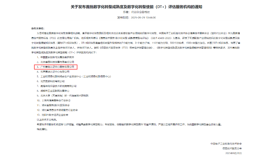 9月29日,中国电子工业标准化技术协会信息技术服务分会(以下称ITSS分会)发布首批数字化转型成熟度及数字化转型使能(DT+)评估服务机构名单,赛宝认证中心成功入选,正式具备相关评估服务资格。